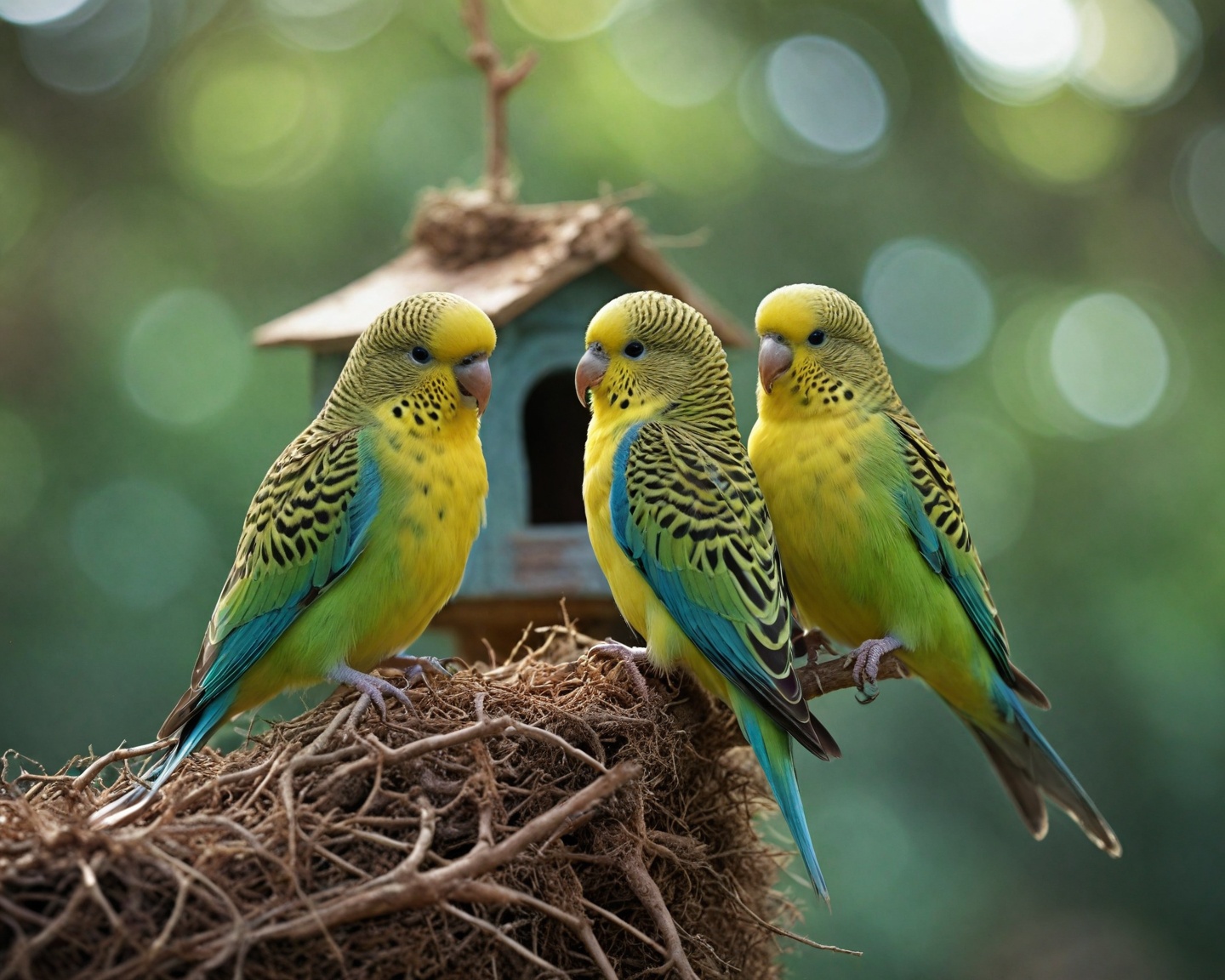 A inclusão de um ninho apropriado é vital. Um bom ninho para periquitos deve ter cerca de 20 x 20 x 25 cm com uma entrada que permita fácil acesso, mas que também ofereça privacidade necessária. Adicionar material para forrar o ninho, como aparas de madeira não tóxicas, ajuda a recriar o ambiente natural e a proporcionar conforto para a fêmea durante a postura dos ovos.